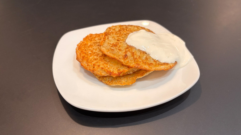 Potato pancakes are a masterclass in savory breakfast items when they're made right. The spuddy stacks are perfectly tasty on their own, of course, though there's a whole slew of toppings you can put on potato pancakes (my personal favorite is good old sour cream). Now, I was pretty excited to see potato pancakes on IKEA's menu, but my excitement ended up being fairly short-lived.