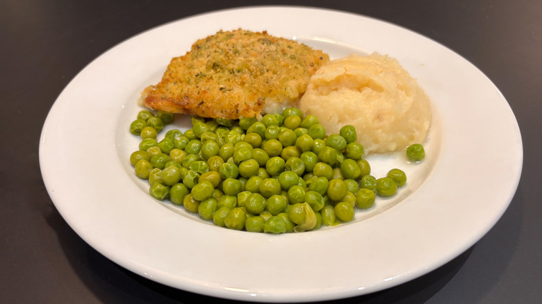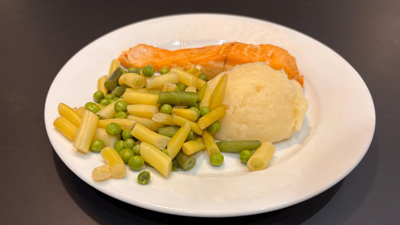 Salmon is an incredibly versatile fish, working equally well in both complex dishes and more simple presentations. I'd argue that IKEA's salmon fillet plate falls into a more simple presentation category, but that's not something I had a problem with. The fillet came with a scoop of mashed potatoes and a medley of green beans and peas, which appeared very bare-bones when it came to seasoning or sauce.