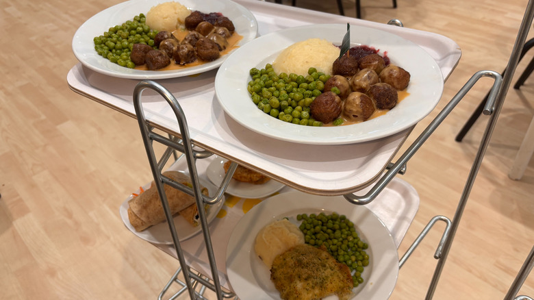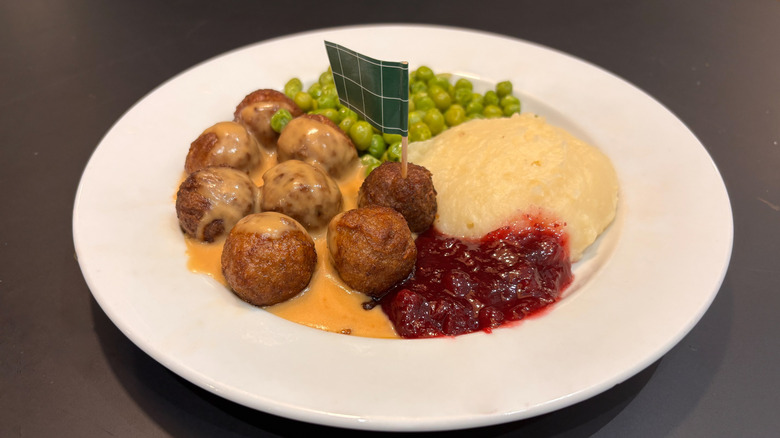 There's just something about the flavors of this plate — which features additional goodies like gravy, mashed potatoes, peas, and lingonberry jam – that work so unwaveringly well together. The meatballs are tender and juicy, and taste even better when smothered in that savory gravy. The lingonberry jam is essential, adding a tart pop that nicely contrasts against all of the plate's savory elements.