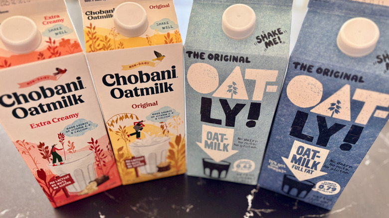 There are seemingly endless dairy-free or plant-based milk options out there, so long gone are the days of being limited to whole milk or 2% in your daily latte. Over the years, various dairy-free milks have had their turn in the spotlight, with notable mentions being soy, almond, or coconut milk. One of the more recently revered dairy-free milks is oat milk, an especially appealing option for those who both can't consume dairy and are allergic to nuts. Oat milk, in its simplest form, contains just two ingredients, oats and water, though many recipes may call for adding maple syrup or some sort of sweetener. It's pretty easy to make oat milk at home, but it's even easier to pick up a carton from the grocery store.