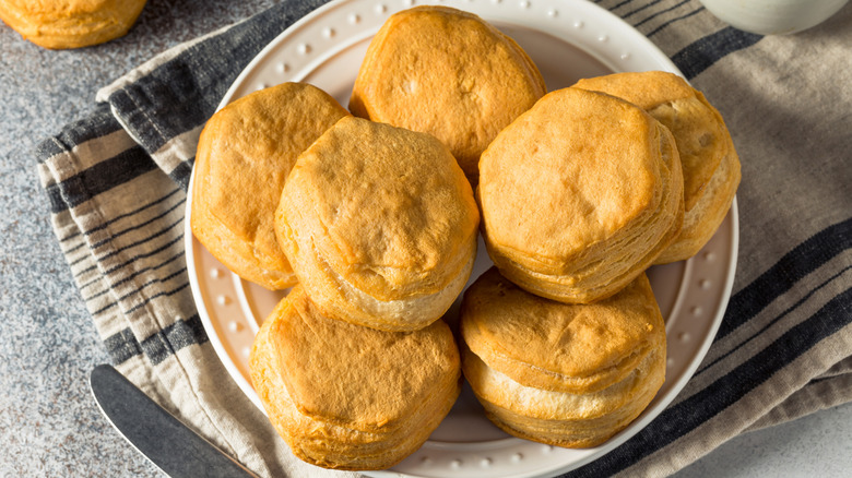 Additionally, the kind of fat you use can impact the taste and texture of your biscuits. According to Craddick, it can also be the source of another fatal baking flaw. Whether you decide to use both butter and shortening in your recipes or choose to brush biscuits with bacon grease, the fat content will impact the result of the bake. "The higher level of fat used results in a better-rising biscuit," Craddick asserts. While some cooks choose to use cold butter in their recipes, this chef does the opposite.