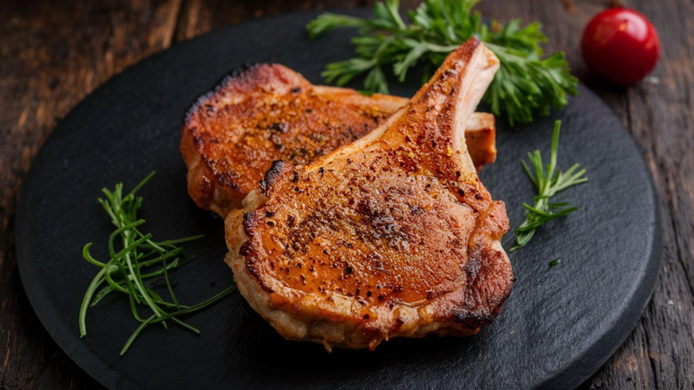 Pork chops are notoriously dry and tough. That's because they tend to be lean, and a lack of fat isn't conducive to retaining moisture, often leading to overcooking. Moreover, it's important to consider a pork chop's thickness when deciding the best cooking temperature. If you go too high for too long, that can also dry it out. Luckily, there's one almost foolproof way to prevent your pork chops from drying out.