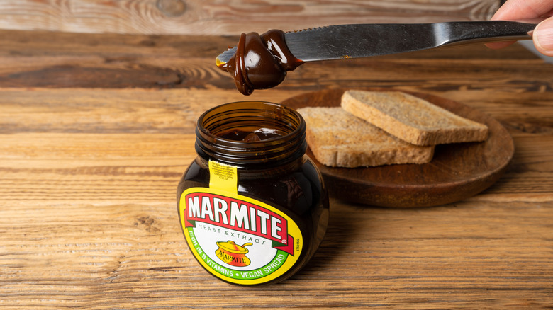 Marmite is an iconic British yeast spread with a famously polarizing taste, popularized by the company slogan, "One either loves it or one hates it." It has a very strong, salty taste and is most commonly spread on toast or bread. It is also sometimes dipped into boiled eggs or used as an additive for stew and soups. Marmite isn't nearly as popular stateside, where it competes with the Australian yeast alternative Vegemite, but in the U.K., it is part of the national heritage. It is so beloved that it now appears in chips or crackers, breadsticks, and pasta. Even high-end restaurants now whip it into butter and blend it into burgers.