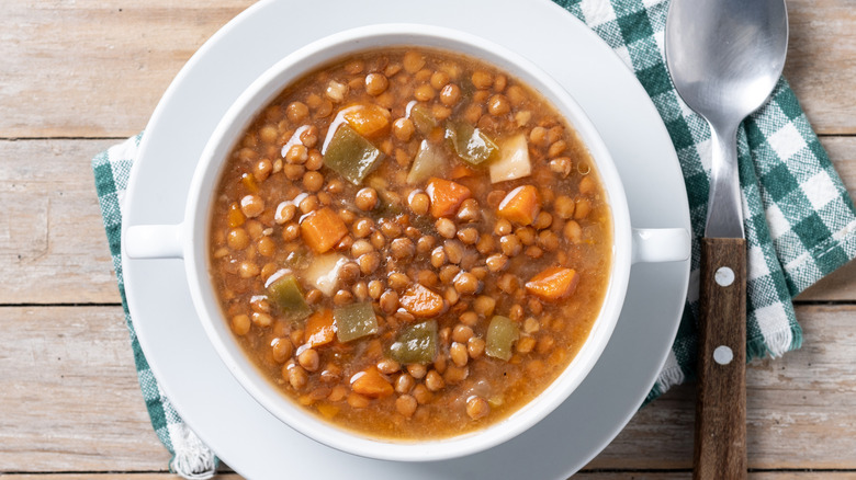 Harrison created an Indian-inspired vegetarian soup recipe that he called dark horse lentil soup. It is described as a hearty soup that combines lentils with spices and vegetables. To make Harrison's lentil soup, gather one red chili, one teaspoon of cumin seeds, two large onions, two chopped cloves of garlic, one cup of lentils, two large tomatoes, two chopped green peppers, one bay leaf, salt, and pepper. Soak the lentils in water, brown the onions and garlic in a pan, add them to the pan along with the remainder of the ingredients, bring them to a boil, and then simmer until the lentils and vegetables are tender.