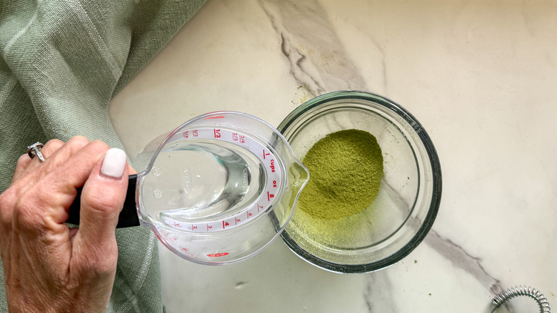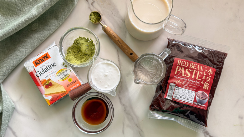Gather the ingredients for matcha pudding with sweet red bean paste