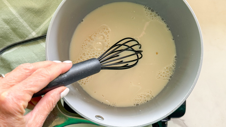 - Add the milk and maple syrup to a pot and bring the heat to medium to warm up for 5 minutes.