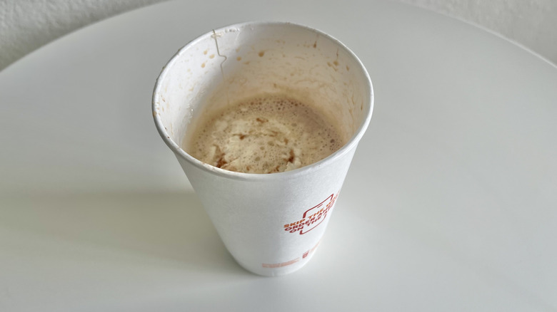 Dunkin's macchiato is very similar to the next two drinks on this list. Only a few small differences set them apart. The macchiato is a layered drink made with milk and two shots of espresso, but the layers were pretty mixed up by the time I got it.