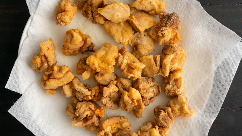 Preserving the freshly fried crunch of your pickles is the final important step in your fried pickle journey. Immediately after removing the pickles from the hot frying oil, Colombi and Jutras recommend resting them on a paper towel to absorb excess oil and prevent soggy disappointment. After all, a fried pickle must be crispy in order to be considered perfect. If you have a wire cooling rack on hand, grab that too: Once you've dabbed the excess oil off your pickles, rest them on a cooling rack with a layer of paper towels beneath it. This baking sheet tip keeps fried foods extra crispy by preventing steam from getting trapped under one side and making the breading soggy.