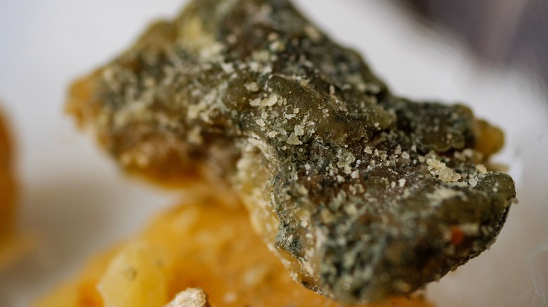 Mold can play a critical role in aging some cheeses, but mold inside the cheese? That's not desirable. This is the main goal of the rind — to protect the cheese. Mold that goes unchecked has the potential to ruin the cheese by seeping in through cracks and edges. Most cheesemakers, though, take their craft and passion to heart and visually inspect the wheels on a regular basis. This attention to detail helps ensure top quality at all times. But what happens if something isn't spotted? If mold is allowed to grow inside, what happens to the cheese? Is moldy cheese safe to eat?