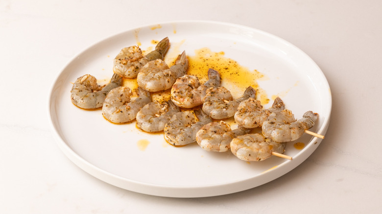 Thread the marinated shrimp onto skewers.