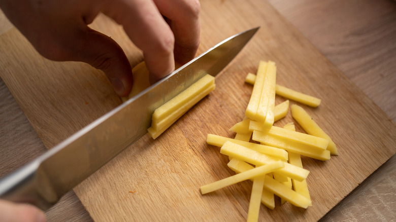 When you're craving french fries, it's easy to open up a bag of the best brand of frozen fries and toss them into the oven or air fryer. But if you've never tried your hand at making french fries at home, it's really not as challenging as you might think; with the right cutting technique, homemade fries can be quite simple. We consulted with Erin Colombi, Senior Vice President of Operations, and chef David Jutras at Fat Patty's, with locations in West Virginia and Kentucky (and soon-to-be New Jersey), about their preferred method for cutting potatoes for perfect french fries.