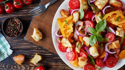 There are several classic Italian recipes that use stale bread in various ways, including the well-known soup, ribollita, and panzanella. Panzanella salad was created out of necessity to avoid wasting food and to make a meal out of what was available when there wasn't much to choose from. Different versions of panzanella exist all over Italy, and it's even thought that in the past, sailors made a version on a ship by dipping hard bread in salty ocean water in order to soften it and make it edible again. But what we mostly think of as panzanella is a juicy salad-like bowl of cubed stale bread, diced tomatoes, herbs, and other vegetables dressed with olive oil and vinegar.