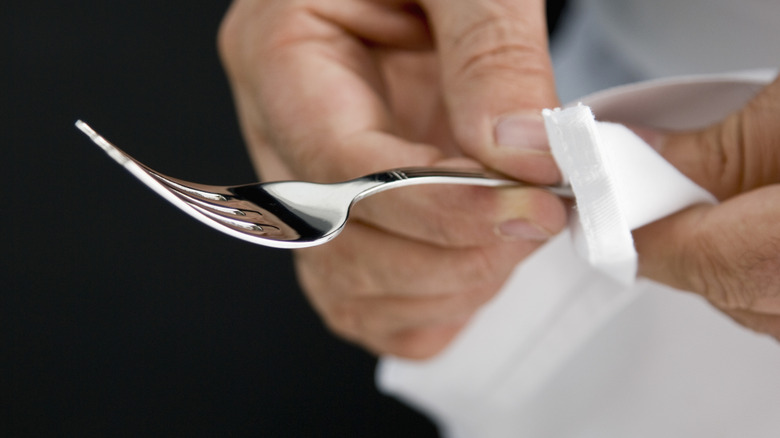 To make this one-ingredient silverware cleaner, mix two parts of water with one part of cornstarch in a small bowl. Coat the tarnished silverware in the paste and place it on a paper towel, letting the cornstarch work its magic for about 15 minutes until the paste hardens. Use a damp cloth (such as a microfiber towel) to gently rub away the paste, carefully working the areas with the most tarnish. Once the paste is rubbed off, take another dry, soft-fiber towel to buff the silverware until it shines.