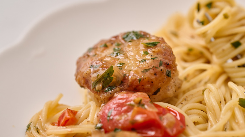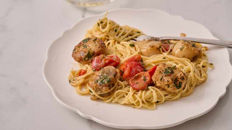 Scallops Provençal is a simple dish that, while considered an entree, isn't really enough to provide a full meal; however, the sauce is made to be served over accompanying sides. The sauce pairs exceptionally well with pasta, pureed celery root, risotto, and steamed vegetables. To serve the scallops over pasta, first choose a long-strand pasta like angel hair, bucatini, or linguini. Boil the pasta to al dente and reserve a small cup of starchy pasta water before draining. When you're finished making the scallops Provençal, add the pasta to the skillet and toss with the buttery sauce. Add a small splash of pasta water to thin the sauce slightly and continue to toss until the pasta noodles are coated and shiny.