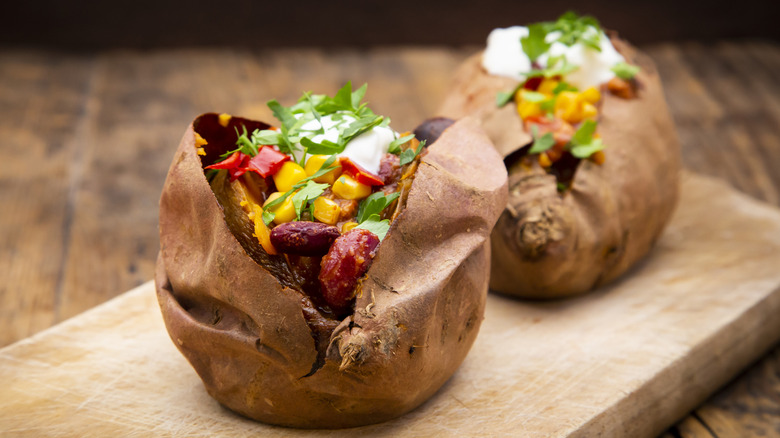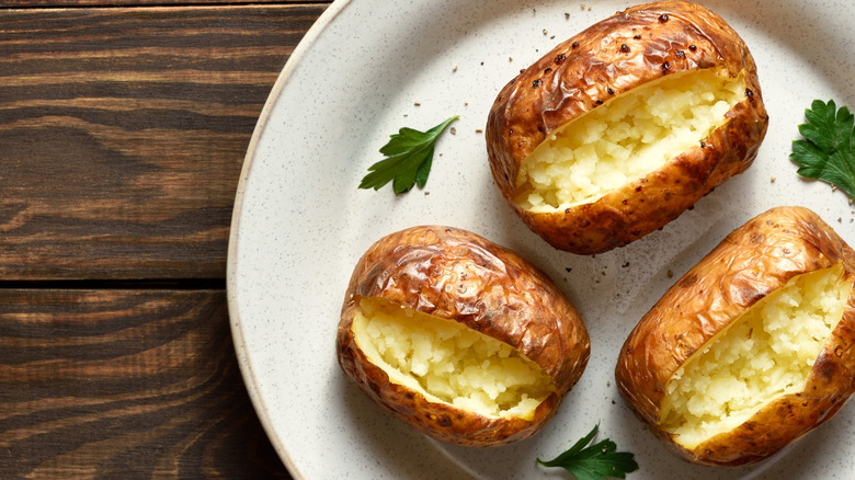 Baked potatoes are an American staple; everyone enjoys them, and they're one of the easiest things to make. And while it's true that a good baked potato only requires piercing a russet potato with a fork a few times, baking it until tender, and serving it with your favorite toppings, a little extra effort can take the side from good to great. The skin, for one, can easily end up chewy or soggy without any care. You may be okay with only eating the fluffy interior, but we're here to tell you that the key to deliciously crispy baked potato skin is easy and worth it. Bake the pierced potatoes as you usually would, remove them from the oven once tender, coat them with oil, and return them to the oven for 10 minutes.