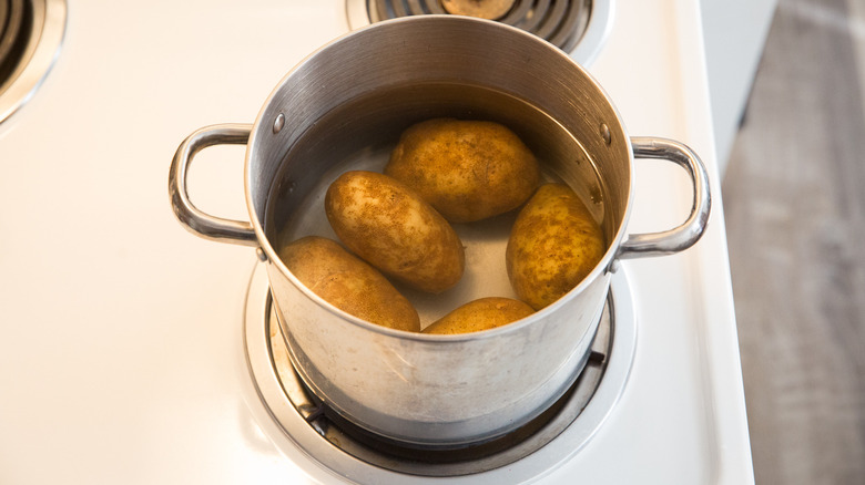 - Place the potatoes in a pot of lightly salted water. Leave the skin on the potatoes.