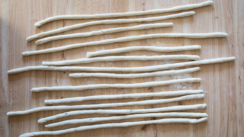 - Press and roll each strip with your palms while pushing them out to the sides to form long cylinders of dough, no more than ½ inch wide.