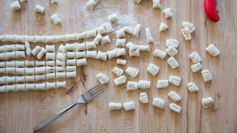 - Press one side of each piece with your thumb to make a depression while rolling the other side against the tines of a fork mark it with lines. Alternatively, you can roll the pieces against a gnocchi board.