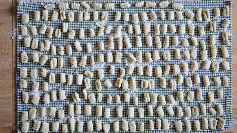 - Sprinkle flour on a kitchen towel before laying the gnocchi down in a single layer. Do not let the gnocchi touch. Sprinkle a little more flour on top and let them dry out slightly.