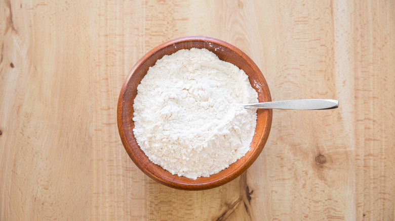 - Sprinkle half the flour on top of the potatoes and start mixing with a fork in a tossing motion, then add the rest of the flour and continue to mix with the fork until the flour is evenly dispersed.