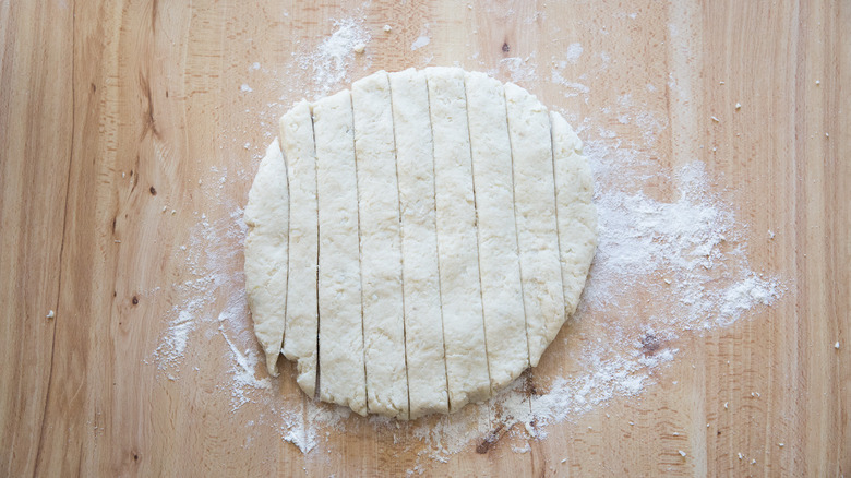 - Flatten the dough until it's about ¾ inch high and cut it into long strips about 1 inch wide.