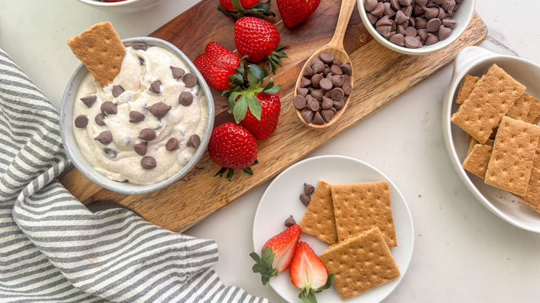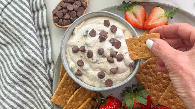 Biting into a cannoli — with its delicate pastry shell and creamy filling — is an Italian tradition that has made its way from Sicily to America, and all over the world for that matter. What started as a treat that possibly dates back as far as the Middle Ages, the cannoli has become a street corner staple and is a creamy, decadent dessert fit for many occasions. Of course, anyone who has tried to make a cannoli completely from scratch, including the shell itself, knows that it's not necessarily the easiest task. This no-fuss cannoli dip skips the shell and highlights the creamy filling packed with rich ricotta, whipped cream cheese, and sweet and crunchy chocolate chips. With only a few minutes of mixing and some chilling time in the fridge, this dip is a twist on a classic that you can enjoy with your favorite dippers.