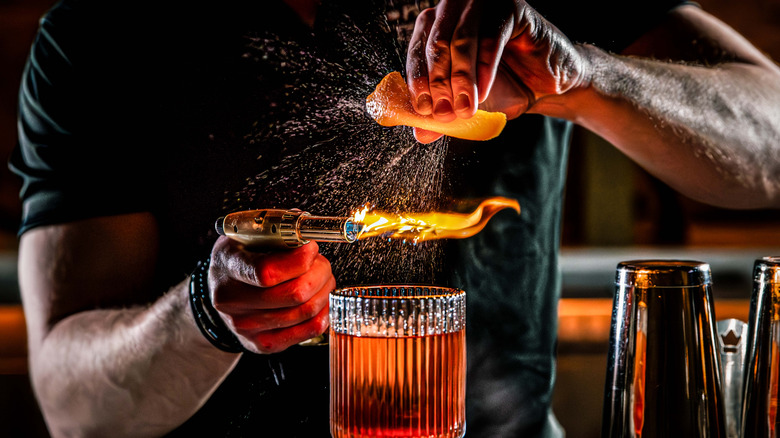 Of course, you'll also need a perfect old fashioned cocktail to top. For that, simply stir your preferred spirit with a few dashes of bitters and some sugar syrup, then pour over ice. Once your cocktail is ready, stick the marshmallow on the skewer, torch until it's nice and charred, and place it on the rim of the glass. If you don't have a kitchen torch, an unscented tealight will also do the trick, as will a second or two under the broiler. Just mind your fingers!