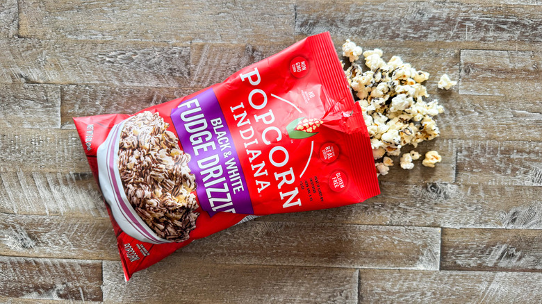 Does popcorn need chocolate? Not necessarily, but it's easy to see how the dark, dense fudgy flavor would elevate an otherwise ho-hum kernel. Popcorn Indiana coats its fudge popcorn in a dark and white chocolate drizzle, which adds a hefty dose of sweetness and helps elevate the overall flavor of the sweet kernels.