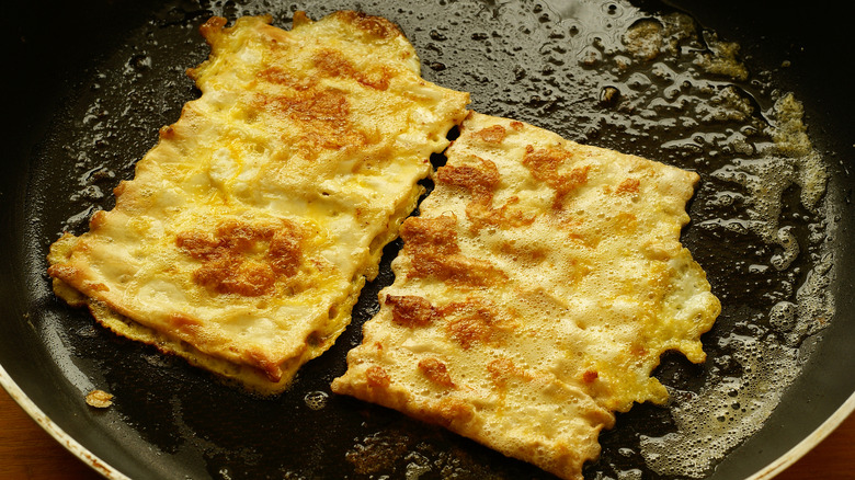 When it comes to preparing a delicious matzo brei meal, it's best to keep things simple. Between the beaten eggs, milk, and matzah mixture, there isn't a whole lot of wiggle room other than making sure the matzah has soaked long enough to become sufficiently tender for pan frying. It might be called "bread" but it's significantly more cracker-like in texture, so getting a good consistency is key.