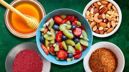 You can simply drizzle a spoonful of honey over your fruit salad for an instant upgrade, or make it into a dressing to coat the dish, like in our simple fruit salad with honey-lime dressing recipe. Combining honey with other ingredients to make a slightly thinner dressing is a great way to impart even more flavor whilst harnessing the power of its luxurious taste and texture. Consider mixing it with warming spices like cinnamon or nutmeg for a lightly spiced dressing, or go bold with creamy nut butter or floral notes of lavender.