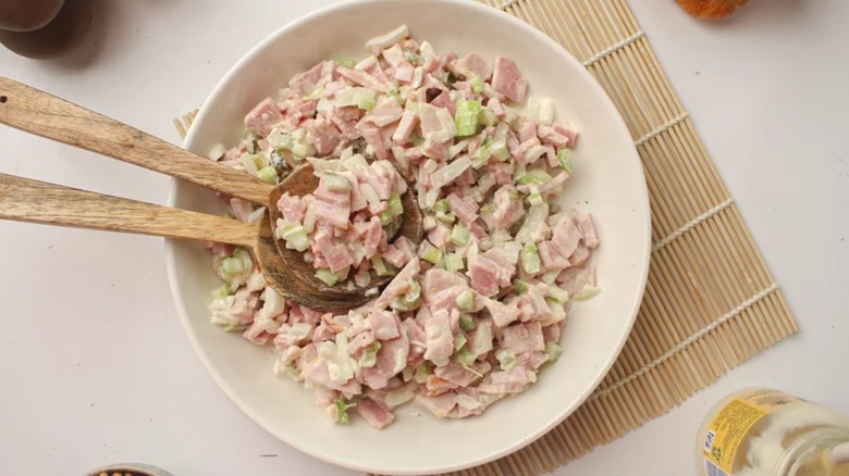 Then, you simply need to chop the ham, along with some celery, white onions, and dill pickles before mixing everything together with some mayonnaise and a hint of mustard. Whether you are planning a backyard barbecue, need a tasty snack to enjoy poolside, or are just looking for an easy meal or side dish, this recipe is certain to be a real winner.
