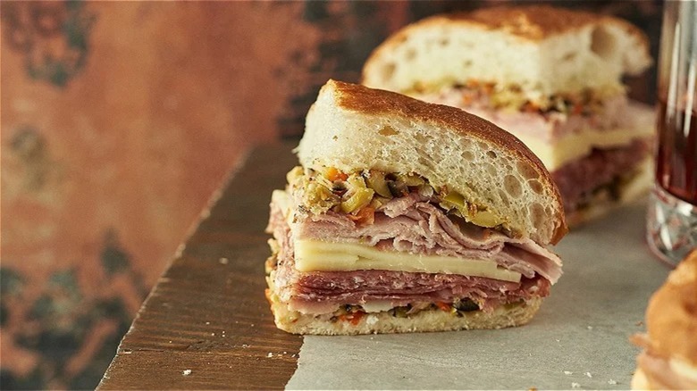 Hailing from New Orleans, a muffuletta is a special sandwich that can help you put that leftover ham to good use. In addition to ham, this sandwich features other flavorful meats, including salami and mortadella, making it as hearty as it is delicious. But the meats aren't the only flavorful additions to this creation. It also includes hot giardiniera, black olives, pimiento-stuffed queen olives, pickled onions, garlic, pepperoncini, and oregano, which work together to give it a tangy and unique flavor.