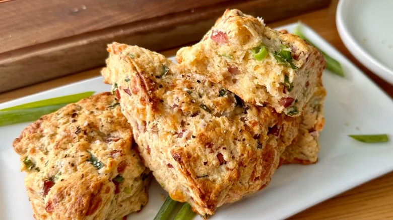 That leftover ham can be used for more than just lunch or dinner meals. You can also use it when preparing a scrumptious breakfast — or brunch — when you make these ham, cheese, and scallion scones. If you've never had a scone before, it is similar to a biscuit, but it is denser and often filled with sweet or savory items — such as the cubed ham, shredded sharp cheddar cheese, and thinly sliced scallions in this recipe from Katie Rosenhouse.