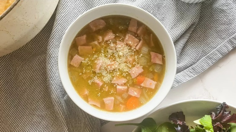 Leftover ham can be a godsend when it comes to cooking hearty and delicious soups and stews. This split pea soup recipe is one that you might want to try. Cubed ham offers the ideal balance for the thinner, cooked-down peas and helps bring out some of the seasonings in the mix, like the rosemary, thyme, and pepper.