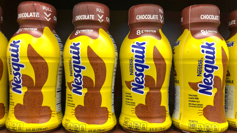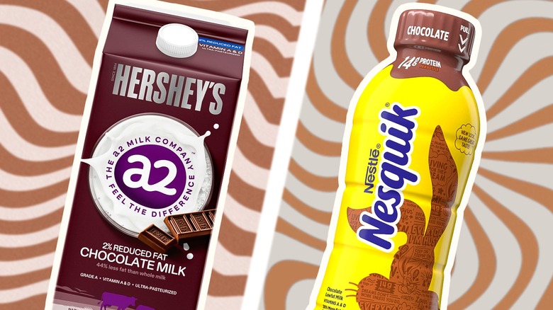 What's your favorite thing about chocolate milk? Is it the comforting flavor and familiar sweetness? Or maybe it's the feeling of a happy inner child as soon as you take that first sip, no matter what age you are. Very often, though, it's not just the drink itself that makes an impact; it's also the brand behind it. When we tried 10 chocolate milk brands, part of our interest was seeing how big names performed against each other. Nesquik and Hershey are two such popular brands, each undoubtedly having its own loyal customer base — but for the undecided and curious, which chocolate milk is actually better? Though neither is particularly exceptional (sorry, folks), Nesquik trumps Hershey.