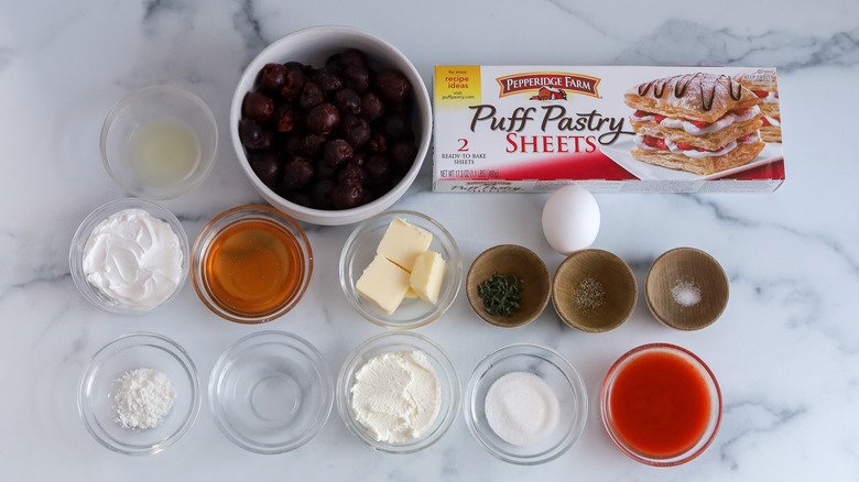 Before you start this recipe you'll have to gather up the ingredients for it. The cherry filling part of this recipe is made with sweet cherries (either fresh or frozen are fine), water, cornstarch, lemon juice, and granulated sugar. The tart base is made with thawed puff pastry. The cheese filling is made with goat cheese, ricotta, chopped thyme, salt, and pepper. You'll also need to make an egg wash with an egg and some water. Finally, for the hot honey component, you will need some hot sauce, honey, and melted butter.