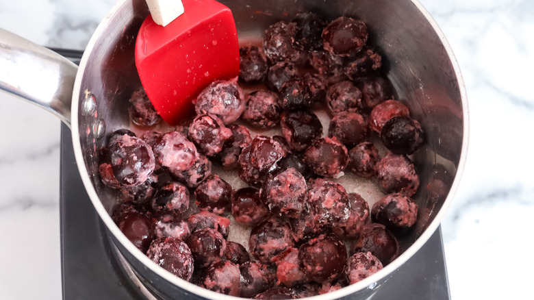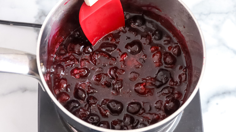 - In a medium saucepan, mix together the cherries, water, cornstarch, lemon juice, and sugar until combined.