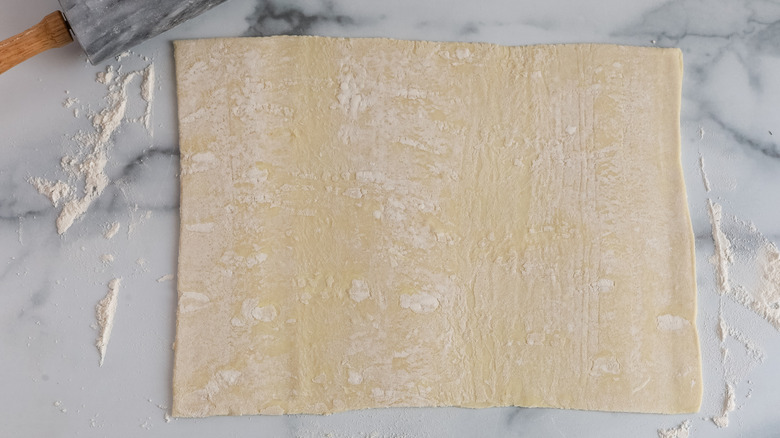 - Place the puff pastry on a lightly floured surface and roll it out until it is a rectangle about 10x14 inches.