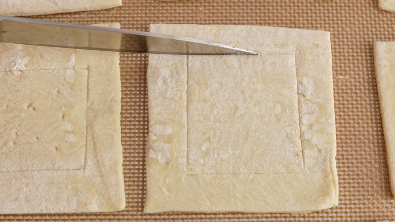 - Place the pastry squares onto the prepared baking sheet. Score a square ¼-inch border into each pastry square (making sure not to cut all the way through the pastry), then poke a few holes in the center.