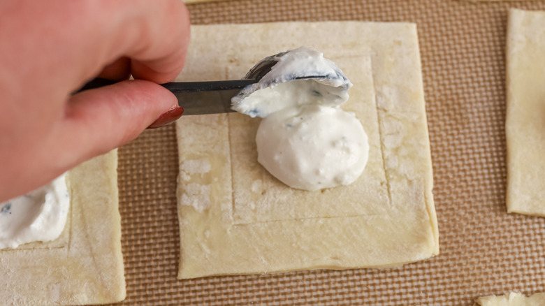 - Spoon about 1 teaspoon of the cheese mixture into the center of each puff pastry square and spread it evenly so it is inside of the scored border. Place in the fridge for 30 minutes to chill.