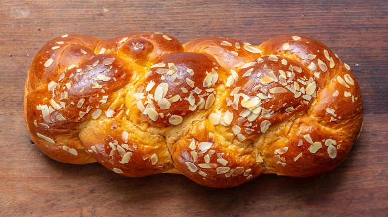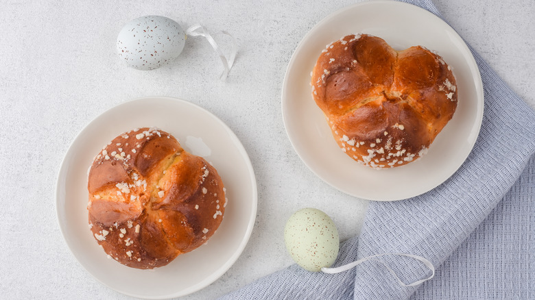 A staple on the Easter table in Greece, tsoureki is a type of sweet bread with a wonderfully fluffy middle and shiny, golden brown crust. It generally features two specific spices — mastic and mahlab — which give the bread a distinct aromatic flavor. Tsoureki can be served alongside both sweet and savory ingredients. It's often soaked in eggs and milk and fried in butter to create French toast, which is topped with fresh fruits and syrup. Or, it can serve as a base for fried or poached eggs.