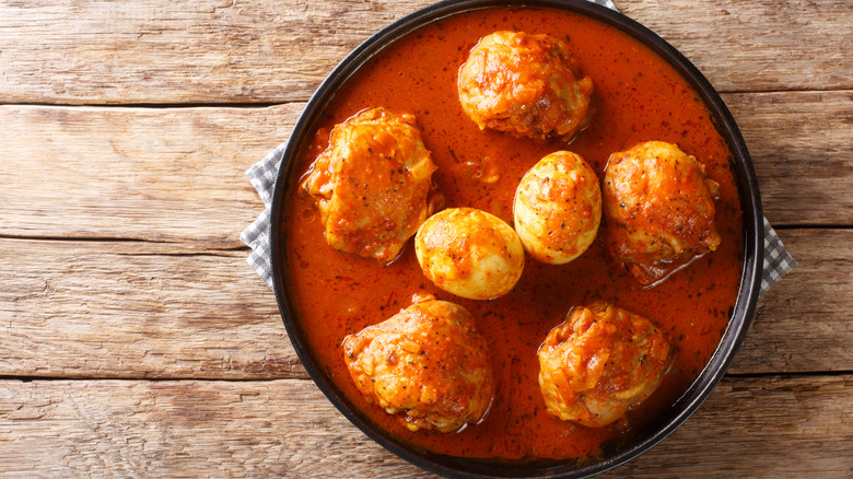 Once all of these ingredients have been simmered briefly with water to create a flavorful broth, you can add the chicken thighs. Then, leave everything to cook slowly in the covered pot for around one hour until the chicken is beautifully tender and falling off the bone. Towards the end of cooking, add the hard-boiled eggs, allowing these to heat through in the flavorful stew before serving.