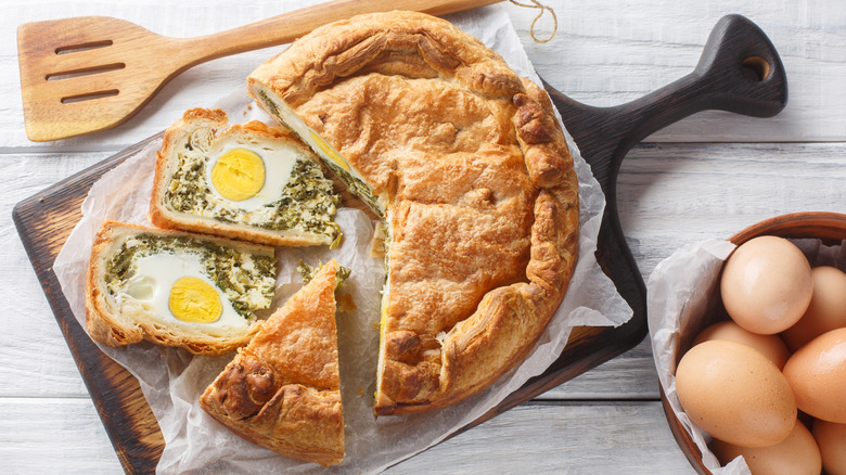 The outer layer of a torta pasqualina is a simple puff pastry, which can absolutely be store-bought. Line a round cake pan with the first sheet of pastry, then prepare the fillings. First, wilt washed spinach leaves in a covered saucepan over low heat. Let these cool, squeeze out the excess moisture, then chop the wilted leaves roughly into small pieces. Mix in ricotta cheese, Parmesan, parsley, an egg, and some salt and pepper, and transfer the mixture to your pastry-lined pan. This will now go into the fridge to chill for 30 minutes or so. The next step is rather fun. You'll create wells in the spinach mixture and crack an egg into each. Finally, top the pie with another sheet of puff pastry, crimping the edges together, brush the top with beaten egg, and bake. As you slice into the pie upon serving, you'll reveal the beautiful cross sections of egg, which look fantastic against that vibrant green spinach.