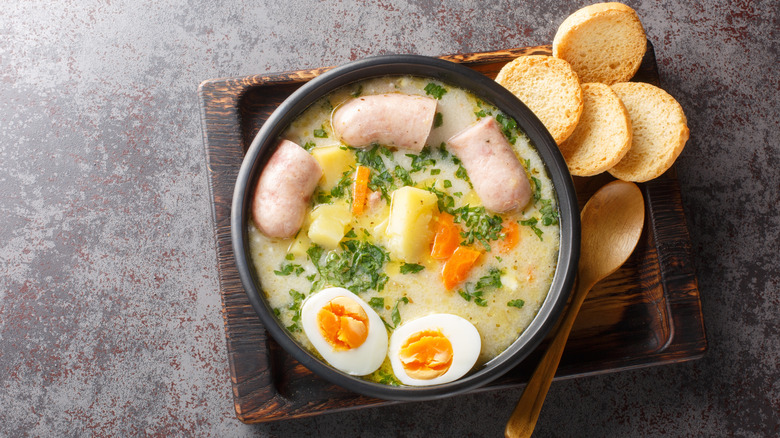 The zakwas, or rye starter, can be made from scratch at least five days before preparing the soup. You'll need rye flour, water, garlic, bay leaves, and allspice berries. Just add everything to a jar, mix well, secure a paper towel over the top with an elastic band, and leave everything to ferment. Give the mixture a quick swirl every 24 hours, and after five days, it'll be ready to add to the zurek. Prepare the base of the soup by sauteing diced bacon and sliced sausage in a large pot. Add your veggies, such as carrot, parsnip, onion, and celery root, as well as garlic and bay leaves. Top the pot up with water, and let the mixture simmer for about 40 minutes. Next, stir in the zakwas and boil everything for a final few minutes before serving the zurek with your toppings of choice. Some people like to add a little prepared horseradish to the soup, too.
