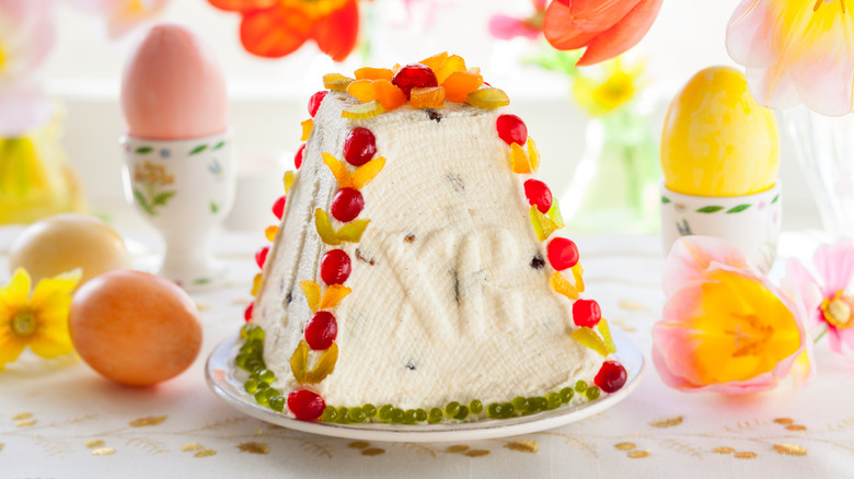 Most pashka recipes feature farmer cheese (aka tvorog), though this is sometimes substituted for cottage cheese, curd cheese, or cream cheese. Your chosen cheese should first be strained through a sieve. Then, you'll whisk egg yolks with sugar until fluffy before mixing in the strained cheese and butter, plus any flavorings of your choice. Nutmeg, citrus peel, and vanilla are popular choices, while some variations feature flaked almonds, sultanas, and even chopped chocolate. Then, gradually stir in heavy cream and transfer the mixture to a cheesecloth-lined pashka mold. The mold will typically have a small drainage hole in the bottom, so set it over a bowl and weigh down the top with a heavy plate to help squeeze any excess moisture out.