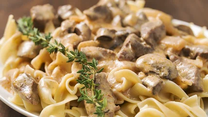 Beef stroganoff has a long history in Russian and French cuisine, but it has become one of the most popular dishes in America because it's easy to throw together and tastes delicious. Modern recipes, like our meaty, creamy, almost fancy beef stroganoff opt for a well-marbled cut of steak like sirloin or ribeye with its rich flavor and ultra-tender texture. However, canned roast beef will make for a convenient and tasty swap in a pinch.