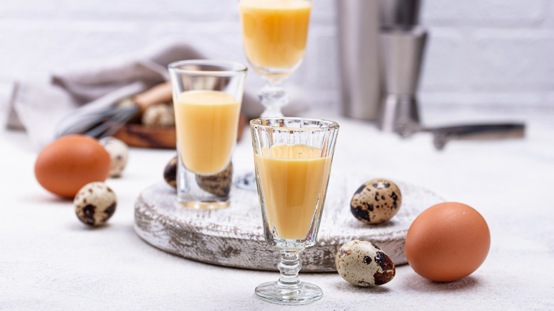 The heat will thicken the eggs, but you'll want to make sure the temperature doesn't get too hot to not affect the alcohol or curdle the mixture. Once the concoction has reached 145 degrees Fahrenheit, set the bowl into an ice bath while continuing to stir the ingredients. Controlling the texture of the drink is one of the benefits of making this at home, and those looking for smoother consistencies can pour the drink through a sieve to remove any clumps that have formed.