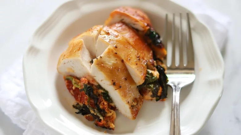 Go gluten-free gourmet with this air fryer stuffed chicken breast recipe. The chicken breasts are stuffed with a flavorful combination of cheese (mozzarella, parmesan, and cream cheese), spinach, and sun-dried tomatoes. If you've never made stuffed chicken breasts before, they're simpler to make than you might think. You just need to carefully cut a pocket into the side of each breast, giving you the opening in which to stuff the other ingredients. Once stuffed, these chicken breasts will take 20 minutes or so to cook in a 375-degree air fryer (times will vary based on your air fryer model and the thickness of the chicken breasts you use).