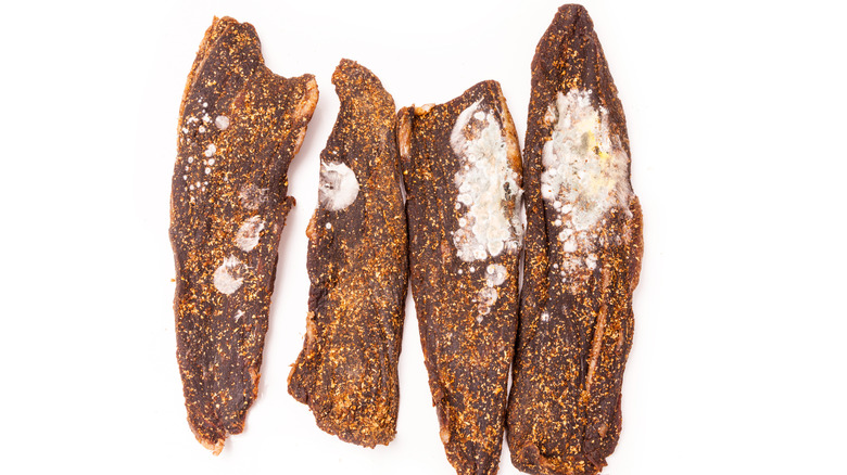 There are some pretty obvious tell-tale signs that your beef jerky has gone bad, and mold is certainly one of them. If your beef jerky was improperly packaged or left in an environment with too much moisture, it is very likely that spores developed into white mold spots, which you absolutely shouldn't eat. You will know that these white spots are actually mold because they will be fuzzy, with an almost spiderweb-like texture to them. They may also emit a strange smell. This is not like the mold found on blue cheeses; instead, it should be thrown away the moment you're sure what it is. Don't try to remove the mold or consume any part of the jerky, as the spores can burrow into the meat and ruin the whole thing.
