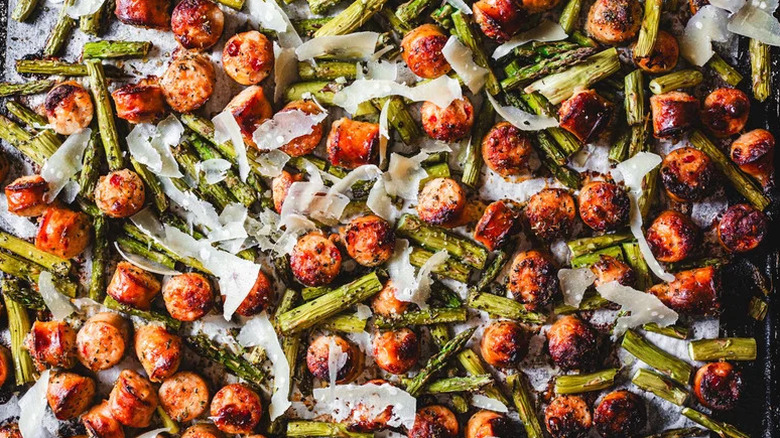 Sometimes, you just need to keep things simple with dinner by choosing a source of protein and a vegetable and calling it a day. That's why we love this recipe for a Chicken Sausage and Asparagus Sheet-Pan Dinner, which is at its most delicious when it's decorated with a layer of grated Parmesan cheese. When the asparagus is fully cooked and the chicken sausage reaches crisped perfection, you'll be ready to eat your simple but filling meal.